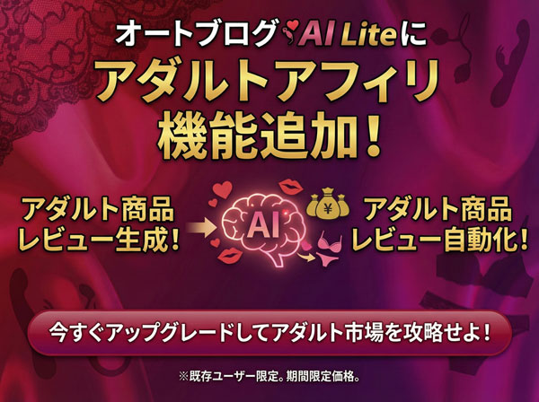 「オートブログAI Lite」のアダルト機能開放版をご購入された方専用の特別価格です。 アダルト機能開放版をお持ちではないとツール本体を受け取れないのでご注意ください。
